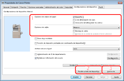 Puede obtener información sobre el dispositivo y actualizar la configuración que aparece en la hoja. (Consulte "Configuración de las opciones de impresora.")