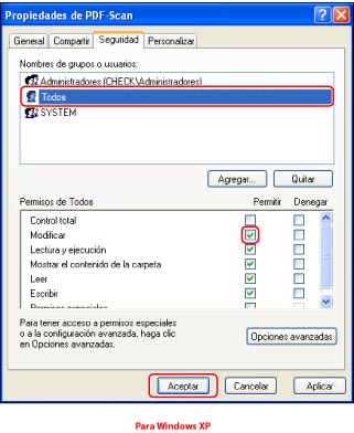 Haga clic en la ficha [Seguridad] → seleccione [Permitir] para <Modificar> → haga clic en [Aplicar].