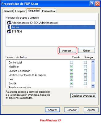 Aparece el cuadro de diálogo [Permisos de PDF-Scan], seleccione [Todos] → seleccione [Permitir] para <Cambiar>.