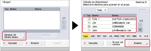 Pulse [Agregar de libreta direcc.] → seleccione tres direcciones de correo electrónico que desee guardar en el grupo → pulse [Aceptar].