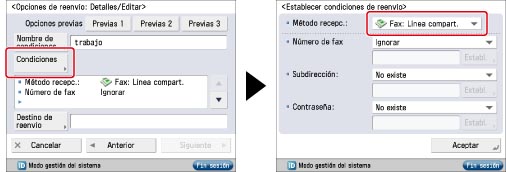 Pulse [Condiciones] → pulse la lista desplegable <Método recepc.> → seleccione [Fax: Línea compart.].
