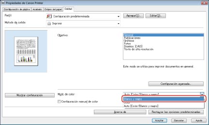 En la hoja [Calidad], pulse la lista desplegable <Modo de color> → seleccione [Blanco y negro].