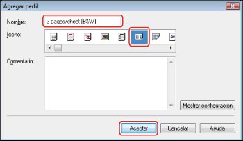 Pulse la lista desplegable <Perfil> → seleccione [2 pages/sheet (B&W)] → haga clic en [Aceptar].