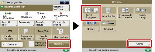 Este modo le permite leer las páginas a la vista de un libro u original encuadernado, imprimirlas y guardarlas en dos páginas distintas.