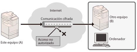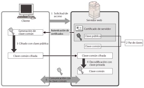 Puede lograr una comunicación cifrada segura cuando el usuario accede al equipo a través de un navegador web instalando un certificado de servidor en el equipo. Con la comunicación SSL, mediante el certificado de usuario y la clave pública se genera una clave común que sólo el usuario y el equipo pueden utilizar. De esta manera se puede impedir la intercepción y el robo de datos. Consulte