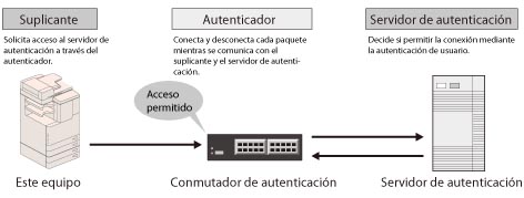 Gestiona toda la información de autenticación a través del servidor de autenticación (RADIUS: Remote Authentication Dial In User Service) y autentica al solicitante. Puede impedir el acceso no autorizado, ya que únicamente el solicitante autenticado por el servidor RADIUS tiene permiso para conectarse a la red por parte del autenticador.