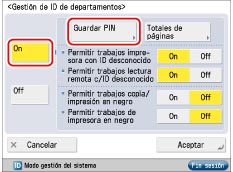 Si se activa la gestión de ID de departamentos a través del Lector de Tarjetas C1/Lector de Tarjetas de Copia F1, no es posible guardar o eliminar los ID de departamentos.