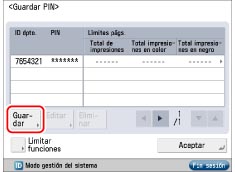 Puede especificar el límite de páginas entre 0 y 999.999. Una vez alcanzado un límite de páginas, no es posible copiar, leer, imprimir.