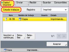 Cancela el trabajo seleccionado. [Detener] aparece cuando se ha seleccionado un trabajo. Pulse [Detener] → [Sí] para cancelar el trabajo.