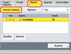 Muestra el estado de recepción de I-fax. [Comprobar RX de I-fax] aparece cuando se ha seleccionado un trabajo.