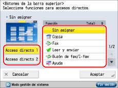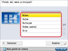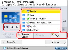 Si el número de botones de función supera el número de botones de la disposición especificada en <Botones del menú principal>, los botones sobrantes aparecen después de la página 2 de la pantalla Menú principal. En la pantalla Menú principal puede aparecer un máximo de nueve botones.