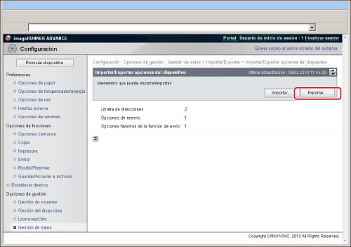 Haga clic en [Importar/Exportar] → [Opciones del dispositivo (Opciones de reenvío, Libreta de direcciones, Opciones favoritas de la función de envío)] → [Exportar].