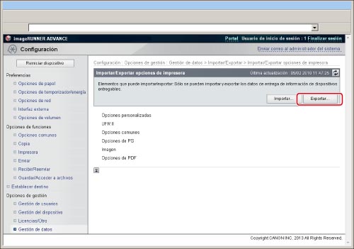 Haga clic en [Importar/Exportar] → [Opciones de impresora] → [Exportar].