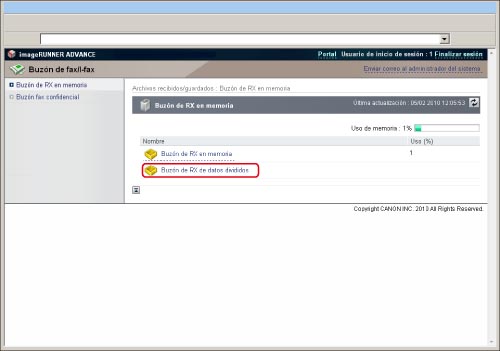 Pulse [Buzón de fax/I-fax] → [Buzón de RX en memoria] → haga clic en [Buzón de RX en memoria].