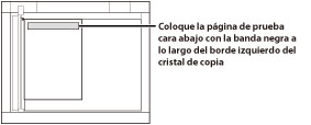 Ponga la página de prueba con el anverso hacia abajo en el cristal de copia, con las bandas negras junto al borde posterior superior izquierdo del cristal de copia por la flecha.