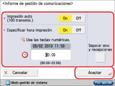 Si está desactivada la opción Ver registro de trabajos en [Opciones de gestión] (Configuración), no aparece [Informe de gestión de comunicaciones].