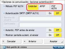 Pulse [Off] para <Autenticación SMTP (SMTP AUTH)> → pulse [On] para <Autentic. POP antes de enviar>.