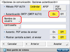 Pulse [On] para <Autenticación SMTP (SMTP AUTH)> → [Nbre. usuario].