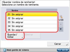 Puede guardar un máximo de 99 nombres de remitente (01 a 99).