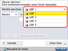 Si se han guardado varios servidores LDAP y se ha activado [Búsqueda automática al usar servidor LDAP] en [Establecer destino] (Configuración), se busca el primer servidor guardado que se muestra en la lista desplegable.