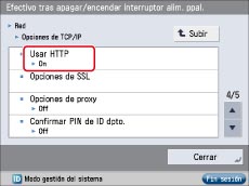 La opción para [Usar HTTP] y [Usar SSL] se activa sólo después de reiniciar el equipo (el interruptor principal se apaga y, a continuación, se vuelve a encender). Para conocer las instrucciones acerca de cómo encender y apagar el equipo, consulte "Alimentación principal y alimentación del panel de control".