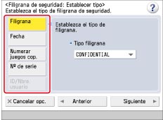 El texto que introduzca en [Person.] no se guarda automáticamente. Si desea registrar su filigrana de seguridad recién creada para seleccionarla cuando lo necesite, pulse [Guardar] → introduzca el texto que desee registrar.