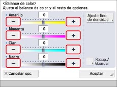 Para ajustar la densidad de cada color, pulse [Ajuste fino de densidad]. Seleccione el color que desee ajustar → utilice [-] o [+] para ajustar el nivel de densidad para las áreas de densidad oscura (alta), media y clara (baja) → pulse [Aceptar].