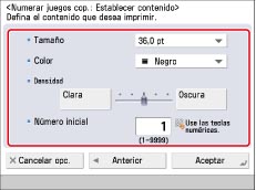 Si está activada [Opcs. accesorio para numerar juegos cop.] de [Opciones de funciones] (Configuración), puede elegir los siguientes tamaños para los números de juegos de copia: [10.5 pt], [12.0 pt] o [14.0 pt]. (Consulte "Opciones de numerar juegos de copias".)