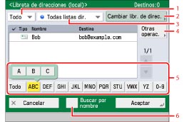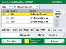 Pulse las teclas alfanuméricas (por ejemplo, [ABC]) para que aparezcan las teclas individuales correspondientes a cada letra o número. Puede seleccionar una letra o número para limitar el intervalo de caracteres. Pulse [Todo] para volver a la lista completa de direcciones.