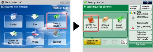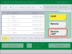 [Cambiar libr. de direc.] aparece solamente cuando están guardados tanto la libreta de direcciones remota como el servidor LDAP. Si solo está guardada la libreta del servidor LDAP en este equipo, aparecerá la opción [A servidor LDAP].