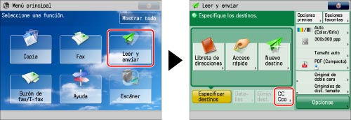Puede establecer varias direcciones de correo electrónico para las direcciones CC (con copia) y CCO (con copia oculta), además del destino de los documentos.