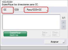 Pulse [Para] o [CCO] → seleccione las direcciones de correo electrónico que desea mover a [CC] → pulse [Aceptar].