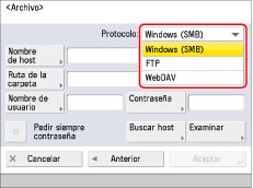 Si activa la opción [Activar/Desactivar cambio de idioma/teclado], es posible que no aparezcan correctamente el nombre de host y la ruta de la carpeta del destino del servidor de archivos, por lo que no podrá consultarlos. (Consulte "Activar el cambio de idioma/teclado".)