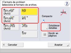 Si selecciona [Compacto] como formato del archivo PDF o XPS, el modo de color cambia de [Auto (Color/Negro)] y [Blanco y negro] a [Auto (Color/Gris)] y [Escala de gris]. Si desea leer el documento con el modo de color que especifique, cambie el formato del archivo PDF a cualquier otro distinto de [Compacto] y [Trazar y suavizar], y cambie el formato del archivo XPS a cualquier otro distinto de [Compacto].