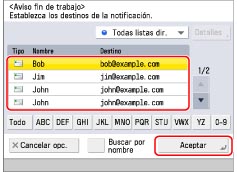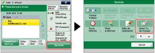 Para enviar un aviso de fin de trabajo, es necesario guardar previamente la dirección de correo electrónico en la libreta de direcciones local o en el botón de acceso directo. (Consulte "Guardar una dirección de correo electrónico".)