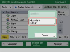 Puede seleccionar un destino y pulsar [Detalles] para confirmar la información detallada del destino. Pulse [Aceptar] para volver a la pantalla anterior.