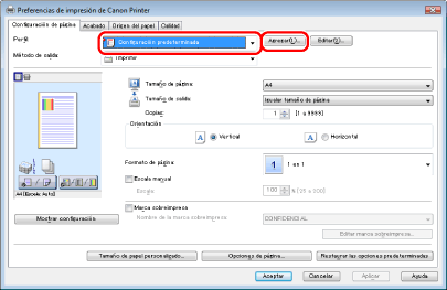 Para editar o eliminar un perfil, en la pantalla del controlador de impresora, haga clic en el botón [Editar], situado a la derecha de [Perfil]. Sin embargo, los perfiles predefinidos no se pueden modificar.
