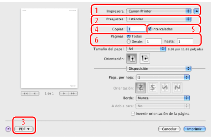 En Mac OS X, versión 10.4.x, las funciones indicadas arriba se muestran en el panel de preferencias [Copias y páginas]. Los ajustes indicados arriba se configuran desde las ubicaciones indicadas por los números correspondientes de la imagen.