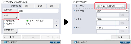 按[条件]→按<接收方法>下拉列表→选择[传真:共享线路]。