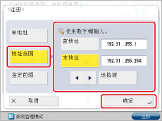 按[地址范围]→按[首地址]并输入“192.31.255.1”→按[末地址]并输入“192.31.255.254”→按[确定]。