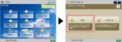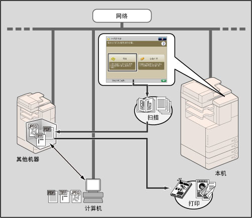 可以将从本机扫描的原稿保存到网络上对外部开放的其他imageRUNNER ADVANCE系列机器的“高级存储箱”。也可以恢复保存到网络上“高级存储箱”的文件,并从本机打印。