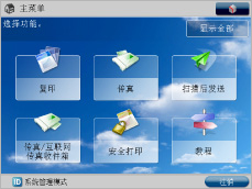 如果[部门识别码管理]设置为“打开”并且为默认屏幕设置了“限制功能”限制的功能,则启动时出现“主菜单”屏幕。(如果[部门识别码管理]设置为“打开”,则“复印”功能受到“限制功能”限制。)要显示为默认启动屏幕设置的功能,请在“主菜单”屏幕上选择该功能→在“登录”屏幕上输入“部门识别码”/密码。