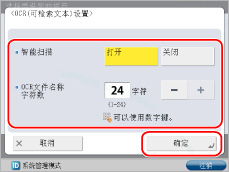 按<智能扫描>的[打开]→按<OCR文件名称字符数>的[-]或[+]设置文件名称的字符数→按[确定]。