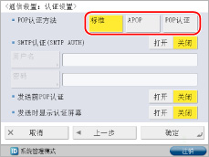 <发送前POP认证>按[关闭]→指定<发送时显示认证屏幕>。