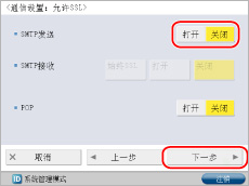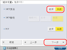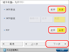 <使用POP接收>按[打开]→<使用SMTP接收>按[关闭]→[下一步]。