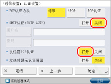 <SMTP认证(SMTP AUTH)>按[关闭]→<发送前POP认证>按[打开]。