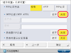 <SMTP认证(SMTP AUTH)>按[关闭]→<发送前POP认证>按[关闭]。