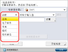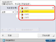 如果注册了多个LDAP服务器并在“设置/注册”下[设置接收方]中将[使用LDAP服务器时自动检索]设置为“打开”,则检索下拉列表上显示的第一个注册的服务器。