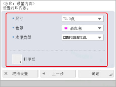 也可以选择在“设置/注册”的[功能设置]的[注册页码编排/水印字符]中注册的文本。 (See "注册/编辑/删除页码和水印的用户定义文本.")
