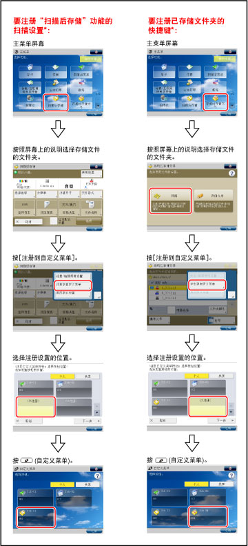 "注册个人按钮/共享按钮,"中以使用“扫描后发送”功能为例,描述了如何在“个人”按钮/“共享”按钮中注册设置的详细说明。